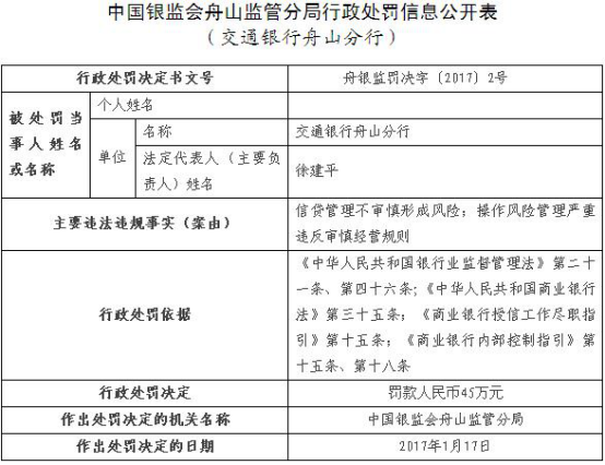 今年2月6日,中國銀監會舟山監管分局6日公布的行政處罰信息公開表顯示,交通銀行舟山分行因信貸管理不審慎形成風險、操作風險管理嚴重違反審慎經營規則被罰款人民幣45萬元。