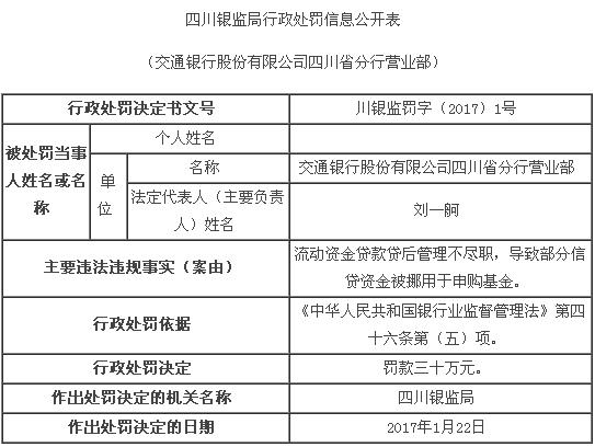 今年2月23日銀監會網站發布消息,交通銀行股份有限公司四川省分行營業部信貸資金被違規挪用于申購基金,四川銀監局依據《中華人民共和國銀行業監督管理法》第四十六條第(五)項對其罰款三十萬元。
