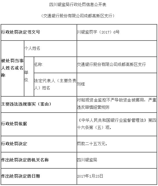 今年2月23日銀監會網站發布消息,交通銀行股份有限公司成都高新區支行對貼現資金監控不嚴導致資金被挪用,嚴重違反審慎經營規則,四川銀監局依據《中華人民共和國銀行業監督管理法》第四十六條第(五)項對其罰款二十五萬元。