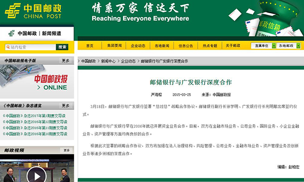 中國郵政官網轉載的中國郵政報對郵儲銀行與廣發銀行簽署合作協議的報道