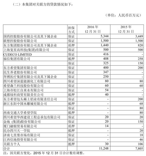 年報披露的對關聯方貸款情況顯示,截至2016年12月31日,貸款額為112.48億元,相較于2015年12月31日的78.05億元,一年內增加了34.43億元。其中,“復星係”涉及金額最多,包括:國藥控股股份有限公司及其下屬企業、上海復星高科技(集團)有限公司,共計58.44億元,增量為18.95億元。