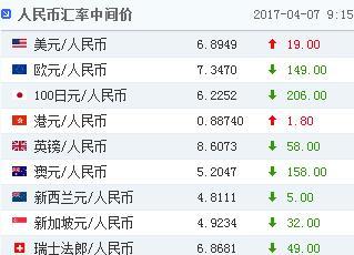 中國人民銀行授權中國外匯交易中心公布,2017年4月7日銀行間外匯市場人民幣匯率中間價為:1美元對人民幣6.8949元,1歐元對人民幣7.3470元,100日元對人民幣6.2252元,1港元對人民幣0.88740元,1英鎊對人民幣8.6073元,1澳大利亞元對人民幣5.2047元,1新西蘭元對人民幣4.8111元,1新加坡元對人民幣4.9234元,1瑞士法郎對人民幣6.8681元,1加拿大元對人民幣5.1451元,人民幣1元對0.64102馬來西亞林吉特,人民幣1元對8.1651俄羅斯盧布,人民幣1元對1.9957南非蘭特,人民幣1元對163.97韓元,人民幣1元對0.53198阿聯酋迪拉姆,人民幣1元對0.54321沙特里亞爾,人民幣1元對42.2751匈牙利福林,人民幣1元對0.57572波蘭茲羅提,人民幣1元對1.0119丹麥克朗,人民幣1元對1.3072瑞典克朗,人民幣1元對1.2493挪威克朗,人民幣1元對0.53733土耳其里拉,人民幣1元對2.7170墨西哥比索。