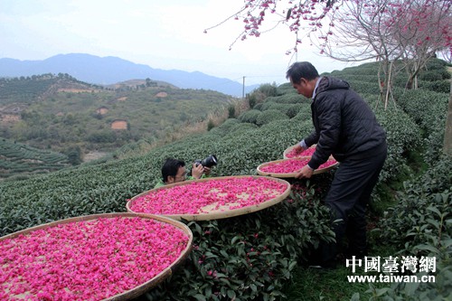 臺商謝東慶在自己的櫻花茶園里晾曬櫻花,準備制作櫻花酒。(中國臺灣網 王偉 攝)