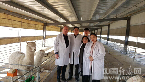 以色列農業專家李伯奇(左一)、北京鴻衫投資管理有限公司總經理補鴻杉(右二)與中鶴集團副總裁侯興福(左二)在中鶴集團種羊養殖區合影