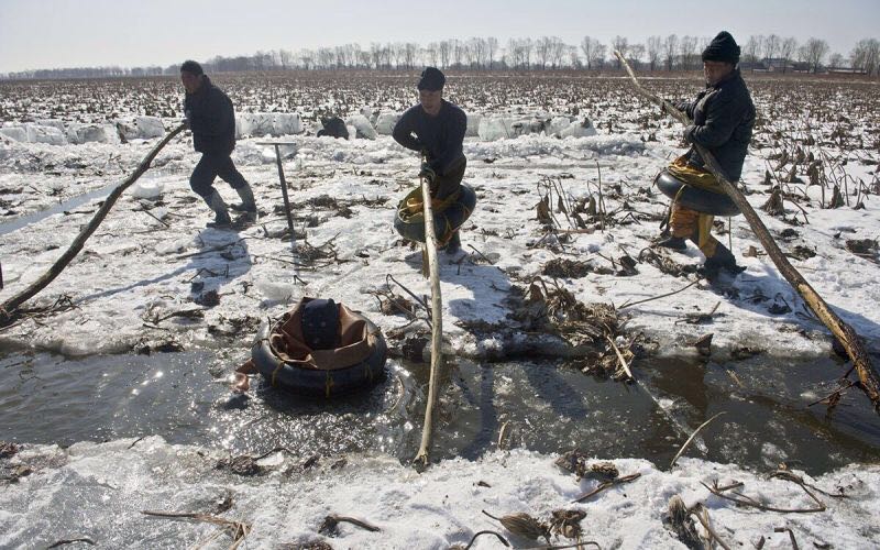 原標題:冰湖採藕人20多厘米厚冰面每天工作超7小時(圖)
