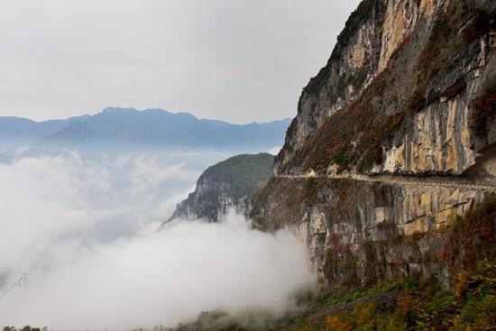 在重慶市開州區滿月鄉雙坪村有一條特殊的農村公路——盤旋于海拔1500多米的高山,上方是岩石,外側是絕壁深淵,雲霧繚繞,險象環生,被稱為“懸崖天路”。