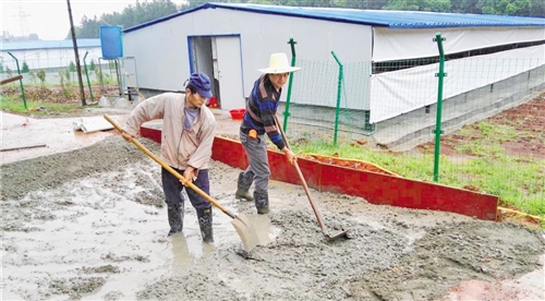 東源村村民在修建肉雞養殖基地的消毒池。說變化: