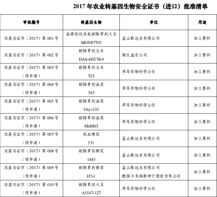 中國農業部發布2017年轉基因生物安全證書進口清單,批準孟山都、拜耳 、先正達等公司的大豆玉米等部分產品。