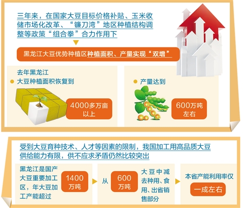 近3年來,在國家大豆目標價格補貼、玉米收儲市場化改革、“鐮刀灣”地區種植結構調整等政策“組合拳”合力作用下,黑龍江大豆優勢種植區種植面積、產量實現“雙增”,去年黑龍江大豆種植面積恢復到4000多萬畝以上,產量達到600萬噸左右。