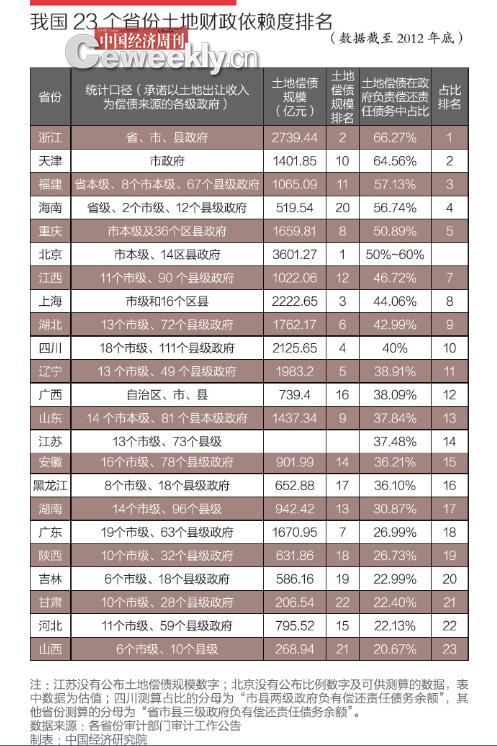 從土地財政依賴度,即“土地償債在政府負有償還責任債務中佔比”來看,排名依次為浙江、天津、福建、海南、重慶、北京(估算)、江西、上海、湖北、四川、遼寧、廣西、山東、江蘇、安徽、黑龍江、湖南、廣東、陜西、吉林、甘肅、河北、山西。