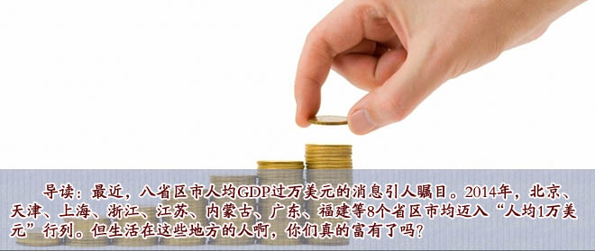 2008年,上海成為首個邁進“人均GDP1萬美元俱樂部”的省份。2009年、2010年北京和天津相繼加入。2012年,江蘇、浙江、內蒙古三個省份同時突破這一大關。2014年,廣東和福建兩個沿海經濟大省也躋身“萬元戶”行列。