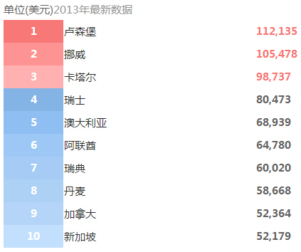 在經濟學領域,人均GDP達到1萬美元是一個重要的分水嶺。一般來說,這是社會的經濟整體發展達到中等發達國家水平的標志。2013年,世界上共有65個國家和地區人均GDP超過1萬美元。下面來感受一下土豪的氣息,看看2013年世界人均GDP前十的排名: