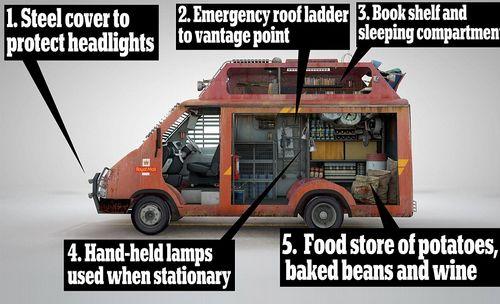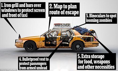 來自英國愛爾蘭科克郡(Cork)的奧基夫(Donal O'Keeffe),以倫敦出租車和皇家郵政車為原型,創作出防僵屍車係的立體設計圖。這位31歲的藝術家稱創作靈感來自他鐘愛的恐怖電影。他意欲營造出一種氛圍:當滿大街都是殺不死的僵屍時,人們無處可逃,只有這些改裝車輛是他們最後的防線。