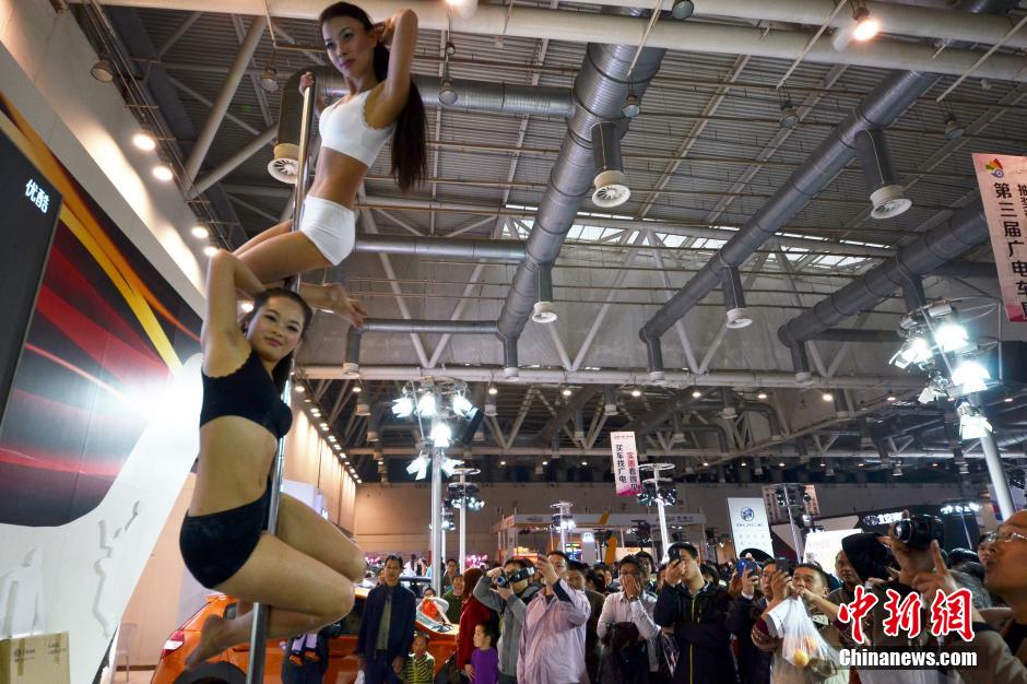 11月24日,第三屆蘇州廣電車展在江蘇蘇州舉行,除了展出的各種品牌汽車外,身材性感火辣的車模、火爆的鋼管舞女郎輪番登場,成為了車展上的一道風景。王思哲 攝