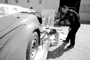 先打開木制的集裝箱,再拆開兩層包裝紙,一輛來自法國的寶藍色老爺車出現在查驗關員的面前。打開展商遞交的報關單,關員需要對車輛發動機型號、車架號碼以及參展車號等各類信息進行核查。