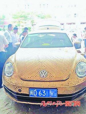 這輛“五毛車”到底是誰的?記者了解到,原來這是廈門某公司的慈善營銷活動用車,號稱全世界僅此一輛,該公司30名員工花費了整整四天時間,將約兩萬枚五角硬幣一個個手工黏貼而成。