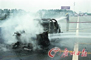 前日15時50分左右,橫欄專職消防中隊趕到現場,只見一輛小車被大火吞噬,伴有濃濃黑煙,由于濃煙影響視線,後方的來車紛紛停在100米以外位置等候,現場交通出現了大堵塞。消防員馬上動用兩支水槍對明火進行撲救。5分鐘左右,明火被撲滅,但轎車車頭蓋及車門已經融化,只剩下車架和輪框。消防員繼續對駕駛室、油箱、發動機等部位進行冷卻。隨後,車主叫來了拖車,但鋼筋已經深深插入底盤,工作人員只好將鋼筋折彎,連同轎車一起送入拖車運走。最後,現場交由路政、交警部門處理。