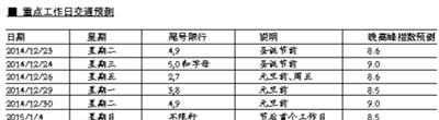 隨著聖誕節和元旦臨近,12月底晚高峰交通擁堵指數預計將居于高位。預計12月23日、24日、26日、29日、30日以及2015年1月4日共6天的晚高峰,或面臨嚴重擁堵。