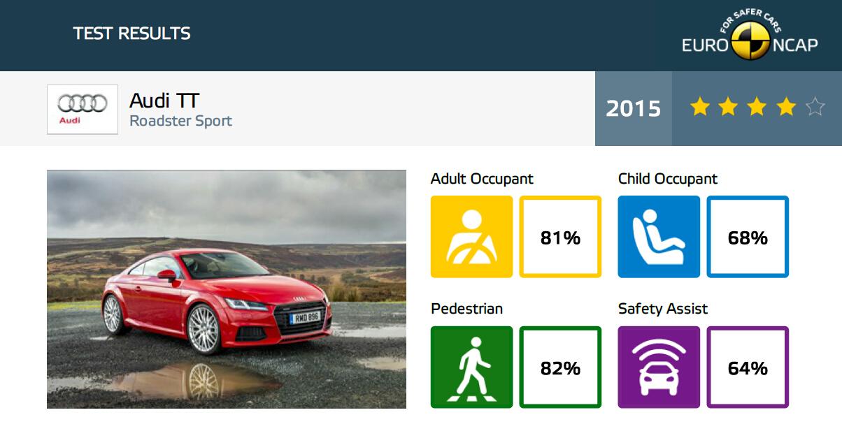 據美國汽車媒體《Autoevolution》2月25日報道,2015年以來,歐盟新車評估組織(Euro NCAP)安全測試規則升級,變得更為嚴苛,奧迪新款TT有幸成為了首款接受規則升級後測試的車型,並獲得了四星評級。