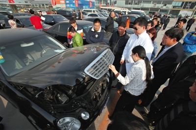 昨日,北京新發地汽車交易市場,預展現場市民正在查看一輛被拍賣奔馳轎車的車況。新京報記者 王貴彬 攝