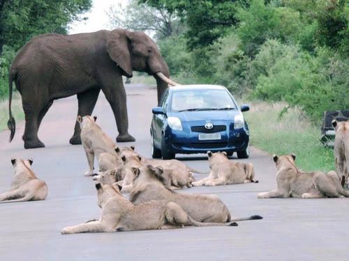 此前,當這輛藍色小車的司機前往克魯格國家公園時,十幾只獅子(包括幼崽)擋住了前去的道路。正在她準備掉頭換一條路走的時候,一只大象不知何時出現在車身後。大象穿過馬路的時候,獅子們一下直起身來,看著眼前的“龐然大物”悠閒而過。