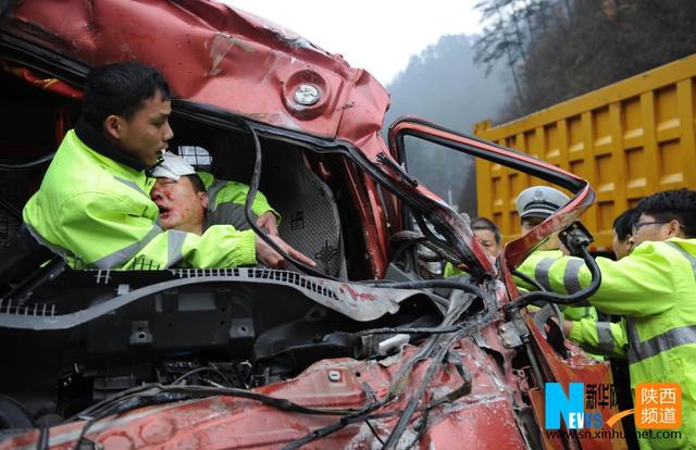 3月25日12時許,西(安)漢(中)高速公路黃草坪隧道附近發生一起多車相撞交通事故,一輛小型貨車的司機被卡在駕駛室內,情況十分危急。及時趕到現場的交警、路政人員與附近路段受阻司機及群眾齊心協力,用繩索拉開被擠壓變形的駕駛室,將司機救出送往醫院。司機已脫離生命危險。新華社記者 陶明 攝