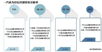 重組預案顯示,2013年,公司前五大客戶中,“一汽係”一汽大眾、一汽轎車等公司在其中,一汽係為當年貢獻的銷售額佔營收比共計達55.4%;2012年,前5大客戶均為一汽係成員,銷售額佔當年營收比例達84.6%;2011年,一汽係為印紀傳媒貢獻了74%的營收。