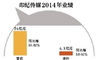 4月9日,印紀傳媒公布的2014年年度業績顯示,公司實現營業總收入24億元,比上年度增長50.82%;實現歸屬于母公司所有者的凈利潤4.3億元,比上年度增長58.02%,同比大幅扭虧;基本每股收益0.48元。同時,公司擬每10股派息0.50元(含稅)。