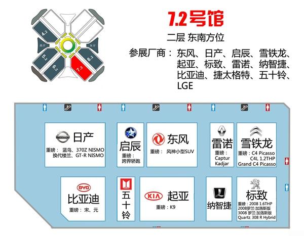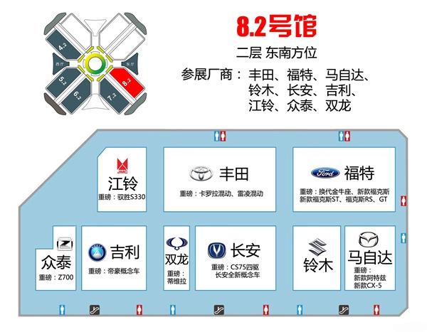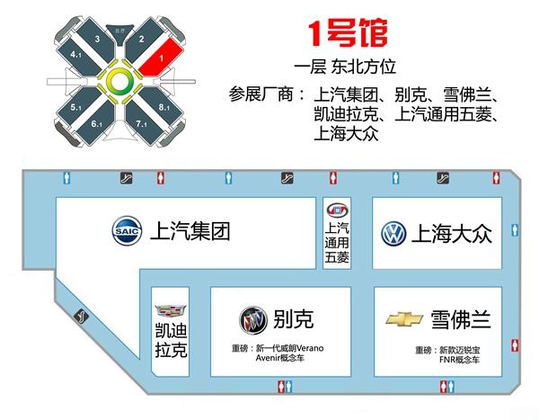 2015上海車展展出總面積超過35萬平方米,啟用國家會展中心全部13個室內展館,其中乘用車8個館(1H、2H、4.1H、5.1H、6.1H、7.1H、7.2H、8.2H)。媒體參展區和新聞中心為8.1H館。此外,館內還設有餐飲區、休息室、醫務室等功能區和服務區,各種設施一應俱全。