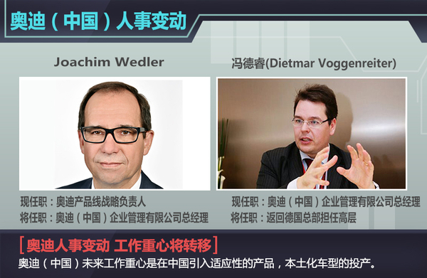 2015年奧迪在中國市場迎來第300萬臺新車交付並同時宣布A3A4A6L等多款300萬紀念版車型上市,中國也是奧迪在全球范圍內的核心市場。近日,奧迪宣布現任奧迪(中國)企業管理有限公司總經理馮德睿將于2015年底離開奧迪(中國)企業管理有限公司總經理職位,返回歐洲;由現任奧迪產品線戰略負責人Joachim Wedler接替,後者曾在一汽-大眾擔任第一副總經理。此次的人員調動,被視為奧迪在華加快產品導入,特別是本土化車型研發和推進更多適應中國市場車型國產的重要舉措。