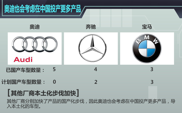 奧迪之前對于中國市場有著“領先者”計劃,為了保持第一陣營的首位,奧迪在中國相繼投產了5款車型,另一方面,競爭對手奔馳已經投產了4款車型並且即將投產MFA平臺的新A級、新B級車型,本地化投產產品數量將追平或超過奧迪,寶馬也計劃在未來在華投產3款新車,整體車型數量達到6款,也將對奧迪實現壓力。奧迪也需要考慮更多適應中國主流市場的產品推進產品的國產化,與奔馳寶馬進行正面競爭確保在市場上的領先者戰略。