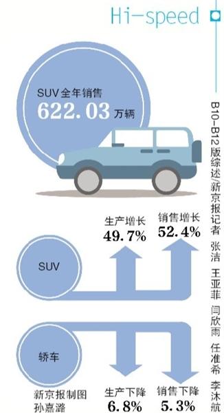 去年,SUV依舊保持高速增長,全年銷售622.03萬輛,市場份額突破30%。中國汽車工業協會的統計數據顯示,2015年SUV產銷增長分 別為49.7%和52.4%,而與高速增長的SUV市場相對應的是轎車產銷量的雙雙下降——轎車產銷分別下降6.8%和5.3%。只生產單一車型的企業需 加快產品規劃速度,豐富自身產品線。