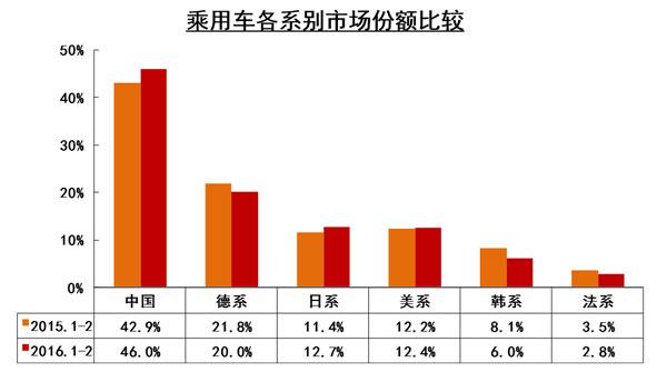 德係、美係、日係、韓係和法係乘用車分別銷售27.51萬輛、17.21萬輛、16.09萬輛、9.28萬輛和3.48萬輛,分別佔乘用車銷售總量的19.98%、12.50%、11.69%、6.74%和2.53%。與上月相比,上述外國品牌銷量均呈明顯下降,日係和法係乘用車降幅居前。