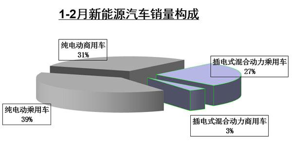 新能源汽車依然保持強勢:1-2月新能源汽車生產37937輛,銷售35726輛,比上年同期均增長1.7倍。其中純電動汽車產銷分別完成27850輛和24835輛,比上年同期分別增長2.6倍和2.7倍;插電式混合動力汽車產銷分別完成10087輛和10891輛,比上年同期分別增長60.1%和68.5%。