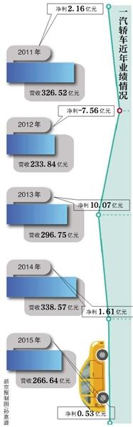 新京報訊 (記者朱星 任準希)3月31日,一汽轎車公布了2015年年報,2015年公司營業收入為266.64億元,同比下降21.25%;凈利潤5294.81萬元,同比下降64.75%。凈利創下2012年巨虧以來的新低。
