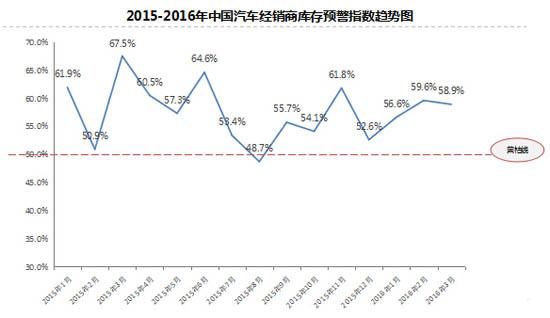 中國汽車流通協會昨日發布數據顯示,3月庫存預警指數為58.9%,比上月下降了0.7個百分點,仍處在警戒線以上。