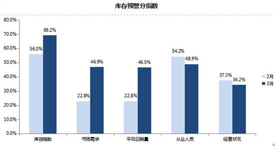 從構成預警指數的5個分指數看,庫存指數、市場總需求、平均日銷量三個分指數上升明顯;從業人員指數、經營狀況指數略微下降。具體分指數變動情況如下: