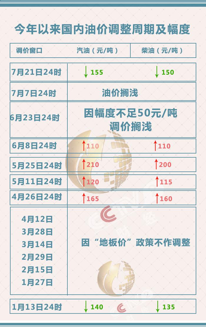我國年內第14次成品油零售價調價窗口期,于7月21日24時開啟。經過前兩次擱淺後,國家發改委宣布,本次成品油價格迎來年內第二次下調!汽、柴油每噸分別下調155元和150元;全國平均來看折合90號汽油每升下調0.1元,0號柴油每升下調0.13元,92號汽油均每升下調0.11元。按一般家用汽車油箱50L的容量估測,加滿一箱汽油將節省約5元。