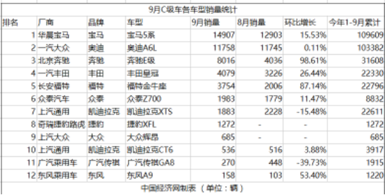 9月,寶馬5係以14907輛的成績,第五次蟬聯C級車冠軍。奧迪A6L銷量11758輛,以3149輛的差距排名第二,且差距較上月有所增加。奔馳E級在換代後首個完整月銷量達到8016輛,環比激增近100%,同比大增61%,成為9月C級車市場最大黑馬。