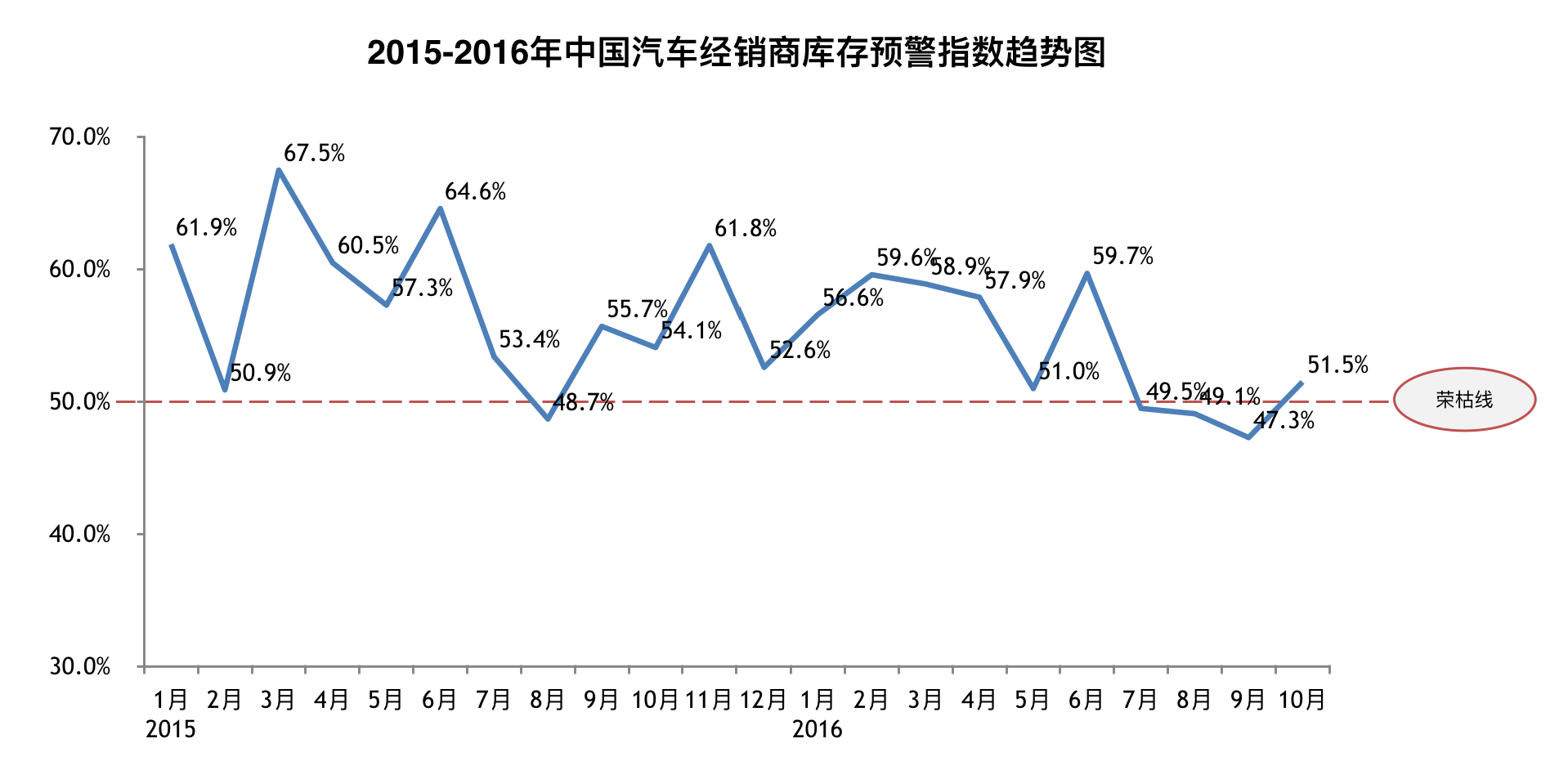 昨日,中國汽車流通協會發布了10月經銷商庫存預警指數。繼連續四個月低于50%榮枯線以下,10月庫存預警指數位于警戒線以上,環比上升4.2個百分點。