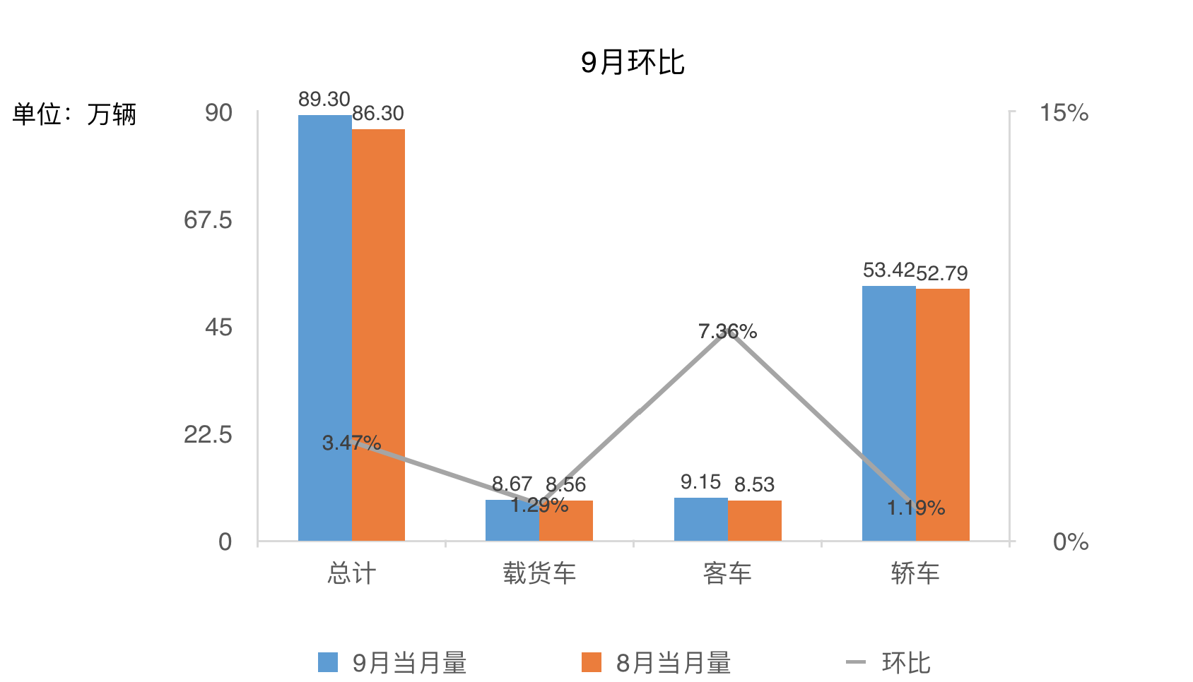 新車銷量持續攀升,從而帶動了二手車的流通。據流通協會公布的數據顯示,2015年9月,全國二手車市場交易量為89.30萬輛,環比增長3.47%,相比去年同期增長13.95%;二手車交易額為513.43億元,環比上升2.90%。其中,客車增幅明顯,提高7.36%,轎車市場繼續回暖,交易量提高1.19%。
