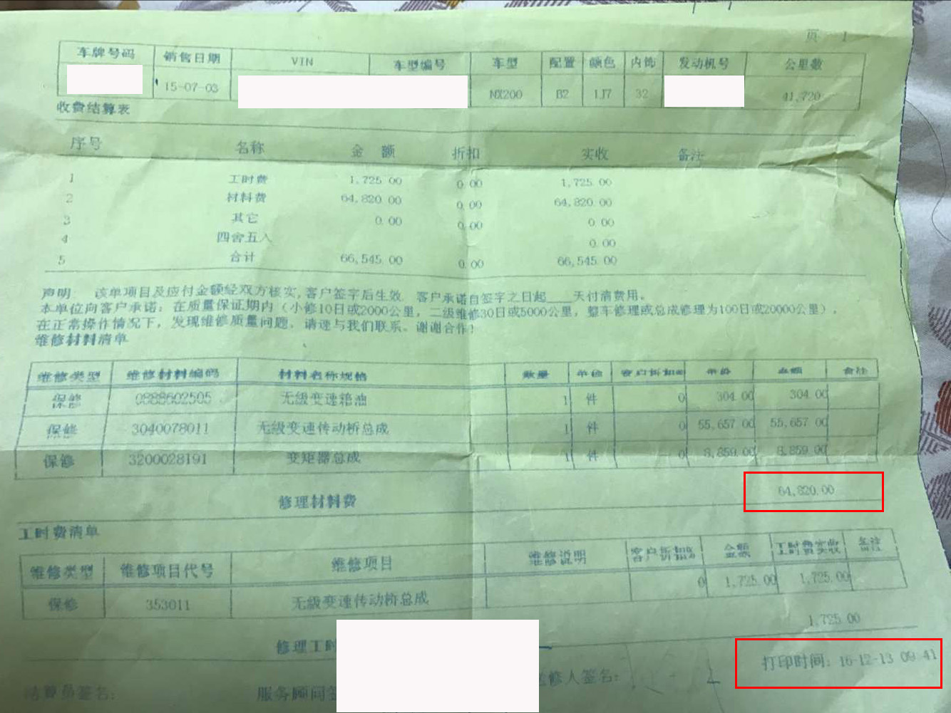 據以上兩位車主透露,目前所有的維修和補償費用均由4S店承擔。另據賴先生提供的維修清單顯示,NX搭載CVT變速箱總成的更換費用總額近7萬元。不過,一旦車輛出保,這筆數額巨大的更換費用將全部由車主承擔。對此,賴先生表示,急切希望自己的變速箱趕緊再壞一次,這樣就可以在質保期內退車;而第一次更換變速箱總成的張茂則希望質檢總局能夠強制雷克薩斯召回問題車輛。