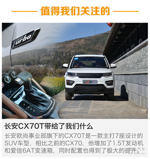 [搜狐汽車試駕]今天我們為大家帶來的是長安CX70T的試駕,這是一款售價8.99-10.99萬元的7座SUV車型,主要的賣點除了大7座空間以及SUV的通過性外本次試駕我們還將重點體驗他新最新升級的1.5T渦輪增壓動力和來自日本愛信的6AT變速箱。