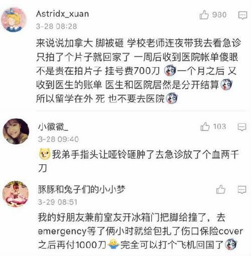 令大家“吐槽”最多的,就是去醫院看醫生。在很多留學生網友心中,這是一件非常“奢侈”的事兒,尤其是急診,一不小心就會付出高昂的費用——