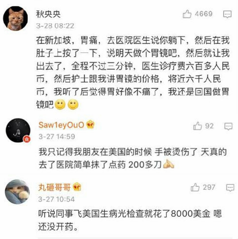還有網友反映,在國外做個簡單的檢查和治療,也可能要讓錢包“疼”一下: