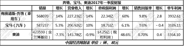 近日,“德係三強”——戴姆勒、寶馬、奧迪陸續公布2017年一季度財務報告。戴姆勒集團延續去年增勢,在2017年首季度繼續保持領先;其乘用車業務更是在營業收入、息稅前利潤、銷售回報率、單車利潤等多項財務指標力壓老對手,成為“三強”中最“賺錢”品牌。