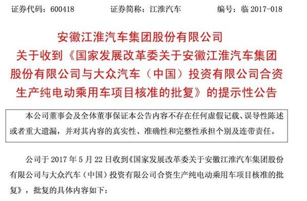 5月22日,江淮汽車(600418)發布公告稱,公司日前收到國家發改委的批復,為促進新能源汽車產業發展,深化中德電動汽車產業合作,同意建設江淮汽車與大眾汽車(中國)合資生產純電動乘用車項目。