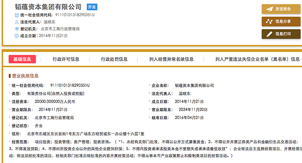 溫曉東為韜蘊資本集團有限公司的法人代表,該公司注冊資本為2億元,溫曉東認繳出資1.8億元,佔出資比例的90%。溫曉東也是藍巨投資控股集團(Lancapital Holdings Group)創始合夥人兼總裁。