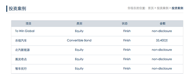 藍巨投資官網顯示,該公司也是樂視移動(20000萬)、樂視體育(32000萬)、樂視影業(未披露)、樂視汽車(33400萬)的投資方。