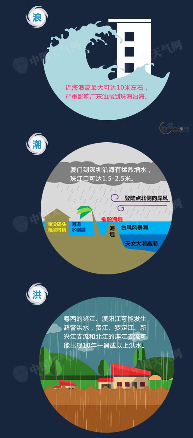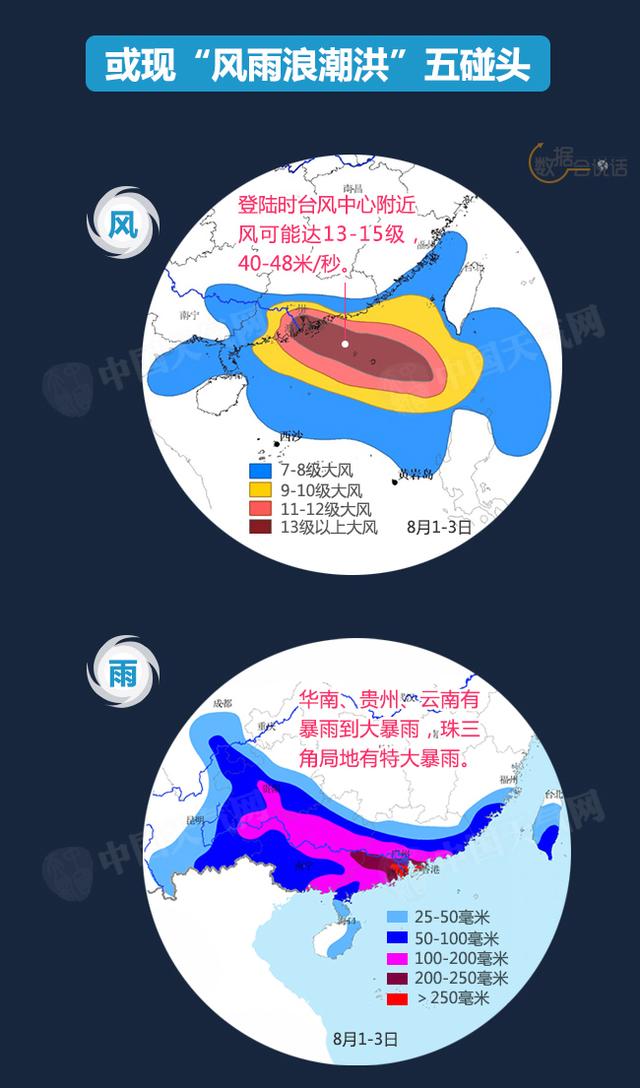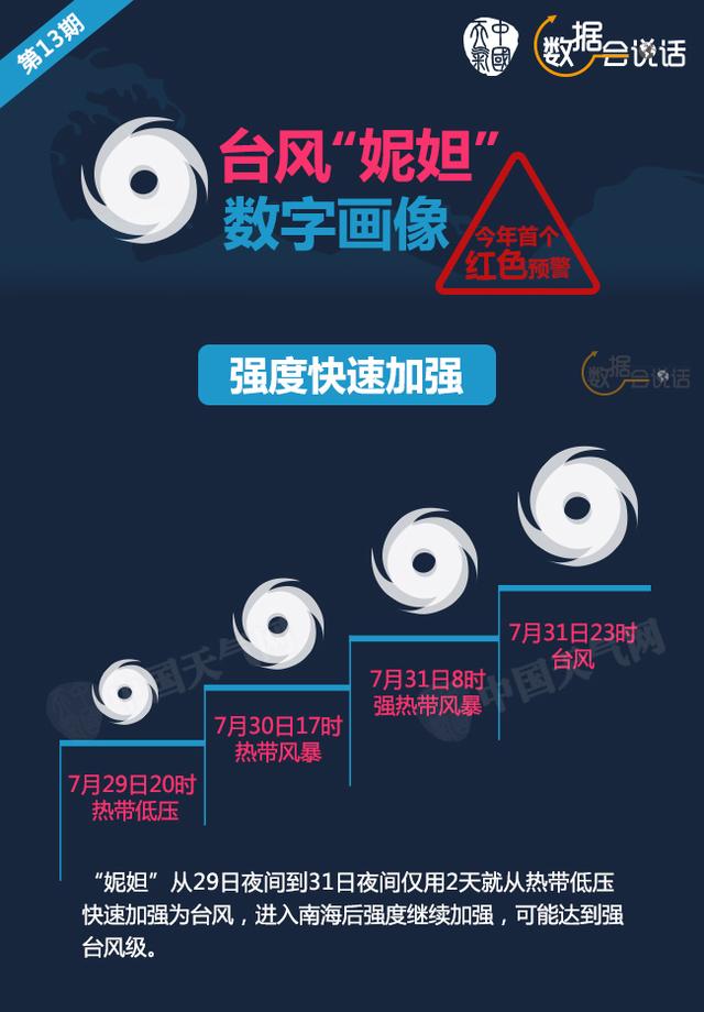 中國天氣網訊 今年第4號臺風“妮妲”強度快速加強,僅2天時間就從熱帶低壓加強為臺風,進入南海後速度明顯加快,移動速度從15-20公里加快至25公里,向廣東奔襲,它將導致“風雨浪潮洪”五碰頭,為此中央氣象臺發布今年首個紅色預警。
